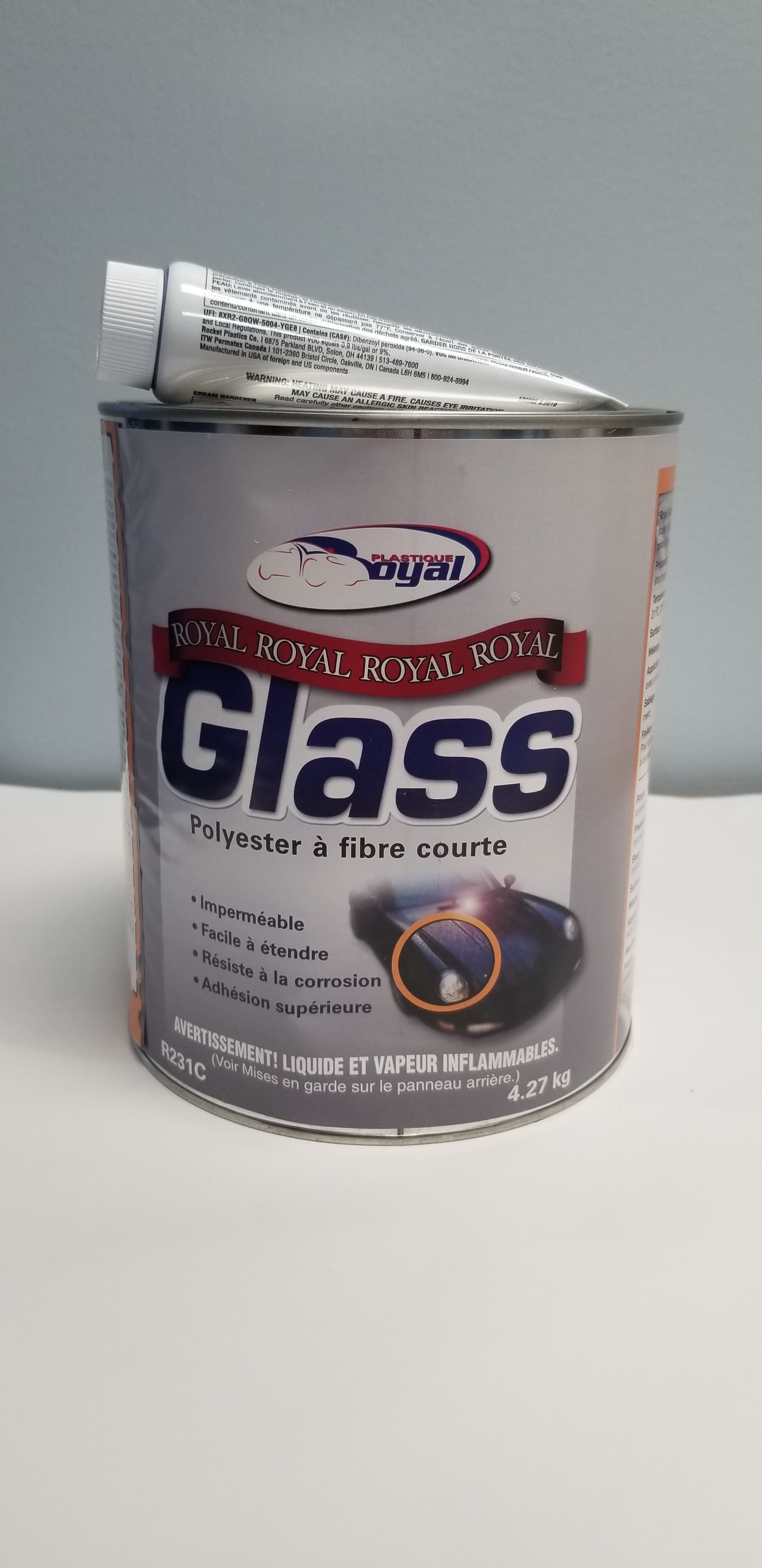 ROYAL GLASS is a unique reinforced, lightweight filler which offers all of the benefits of typical short strand fiber reinforced fillers. Extremely easy sanding and easy spreading. Apply to bare steel, galvanized steel, aluminum, fiberglass, SMC, plaster, concrete, masonry and wood. Ideal for non-structural repairs. Blue cream hardener included.