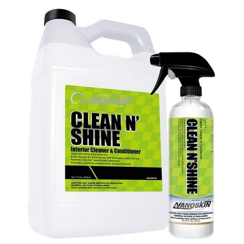 CLEAN N ' SHINE Interior Cleaner & Conditioner easily removes dirt, grime, and oily soils from leather, plastic, and vinyl while restoring a natural sheen/satin gloss to the surfaces being cleaned without leaving oily and greasy residue. Timesaving, ready-to-use formula cleans and shines at the same time. Proprietary conditioner prevents drying, fading, and cracking.