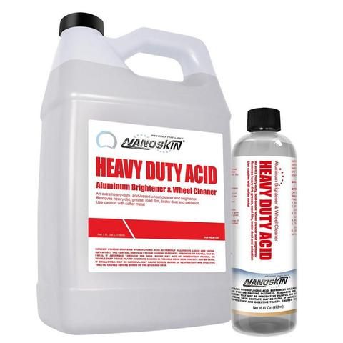 NANOSKIN HEAVY DUTY ACID is an extra heavy-duty, concentrated, acid-based wheel cleaner and brightener formulated for most wheel types. DO NOT USE on: PVD, polished uncoated aluminum, plastic, or anodized wheels.
