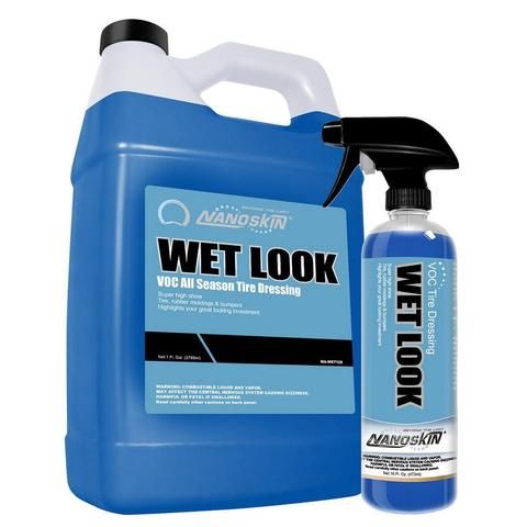 Vous avez ciré et poli votre véhicule, enlevé les taches et les odeurs et pris soin de la sellerie et du cuir. Il est maintenant temps de s'attaquer à la brillance de vos pneus. Rien ne se remarque plus rapidement après le lavage que vos pneus brillants. NANOSKIN WET LOOK est un ‘’dressing’’ très brillant à base de silicone pour les surfaces extérieures. L'application au pinceau ou à l'éponge est recommandée. La formule à séchage rapide et à faible adhérence fonctionne très bien sur les pneus. Il complète vraiment "le look" que les détaillants automobiles veulent.